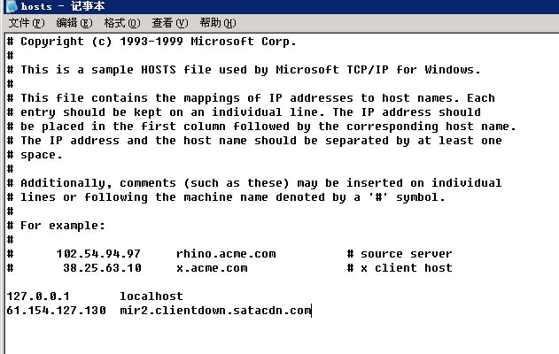 也就是两个文件并不是完全相同的,判断是下载的文件的问题。这边ping了下载地址的域名(mir2.clientdown.satacdn.com),发现解析地址有差异,下载运行正常的解析地址是61.154.127.130,而且有问题的下载地址都解析到了上海的节点218.1.69.129,这边使用hosts文件进行解析地址修改: